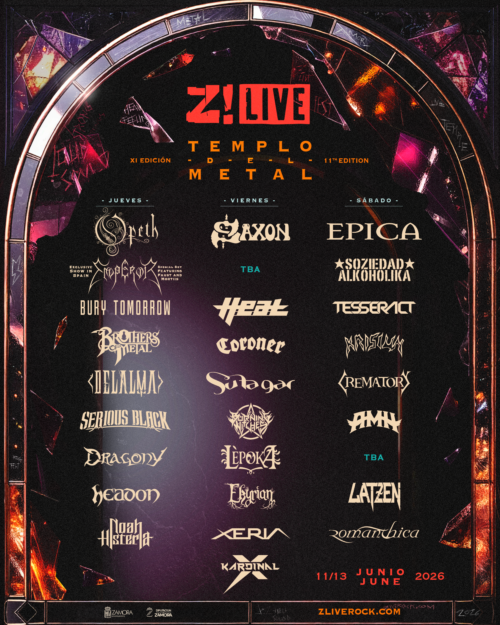 Epica es la última confirmación de un cartel que apuesta por el eclecticismo y la variedad. Tocarán el día 13 de junio junto a bandas como Tesseract, Krisiun, AMH y Crematory. El resto de las jornadas no se quedan atrás, destacando el día 11 de junio Opeth, Emperor, Bury Tomorrow y Brothers of Metal, y el 12 de junio Saxon, Heat, Coroner y Burning Witches. También habrá buena representación de bandas nacionales como Soziedad Alkohólica, Headon, Lèpoka y la única actuación confirmada hasta la fecha de Delalma. Además, aún quedan dos bandas por confirmar, y una de ellas encabezará la segunda jornada junto a Saxon.